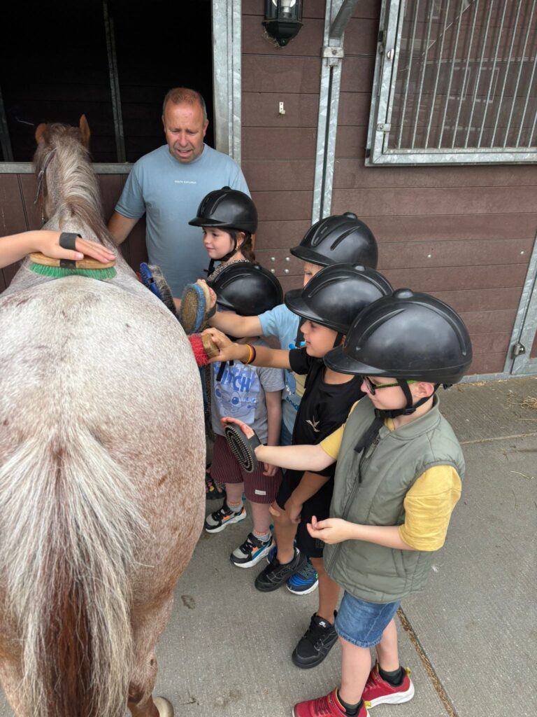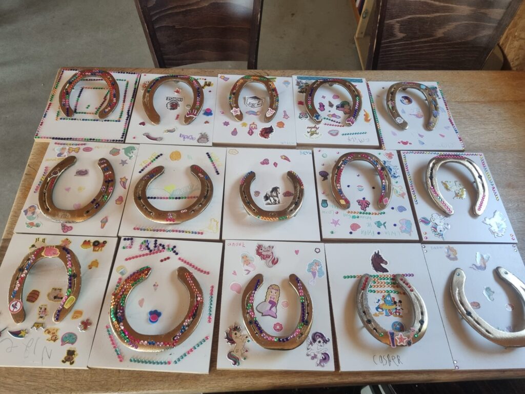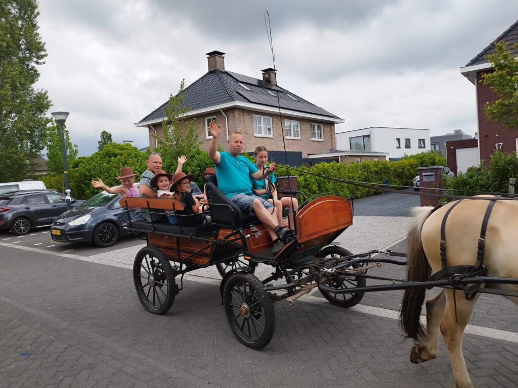 Kinderen gaan eerst pony’s borstelen, daarna gaan ze rijden en hoefijzers versieren. Na afloop eten we gezellig poffertjes of pannenkoeken. Kosten zijn € 19,00 per kind. Voor het thuisbrengen met de huifkar komt er € 50,00 bij.